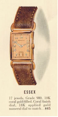 Hamilton produced the coral gold Essex, now known more commonly as rose gold, from 1940 through 1941. The coral color is a gold and copper alloy, which is likely why it was only used for two years; Copper was needed to help with the war effort.