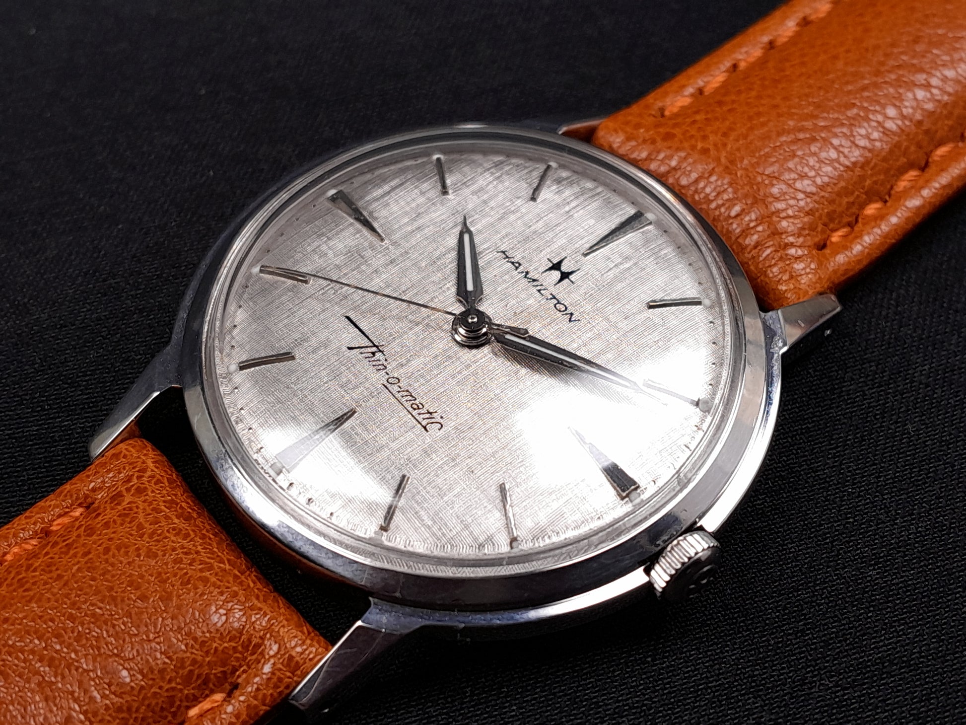 Dial - Silver linen textured dial. Applied silver tone markers. Painted Hamilton, 'H' logo, and script Thin-o-Matic branding. Pearlized minute track. Paint on the dial is in excellent condition. Hour pips relumed during service.