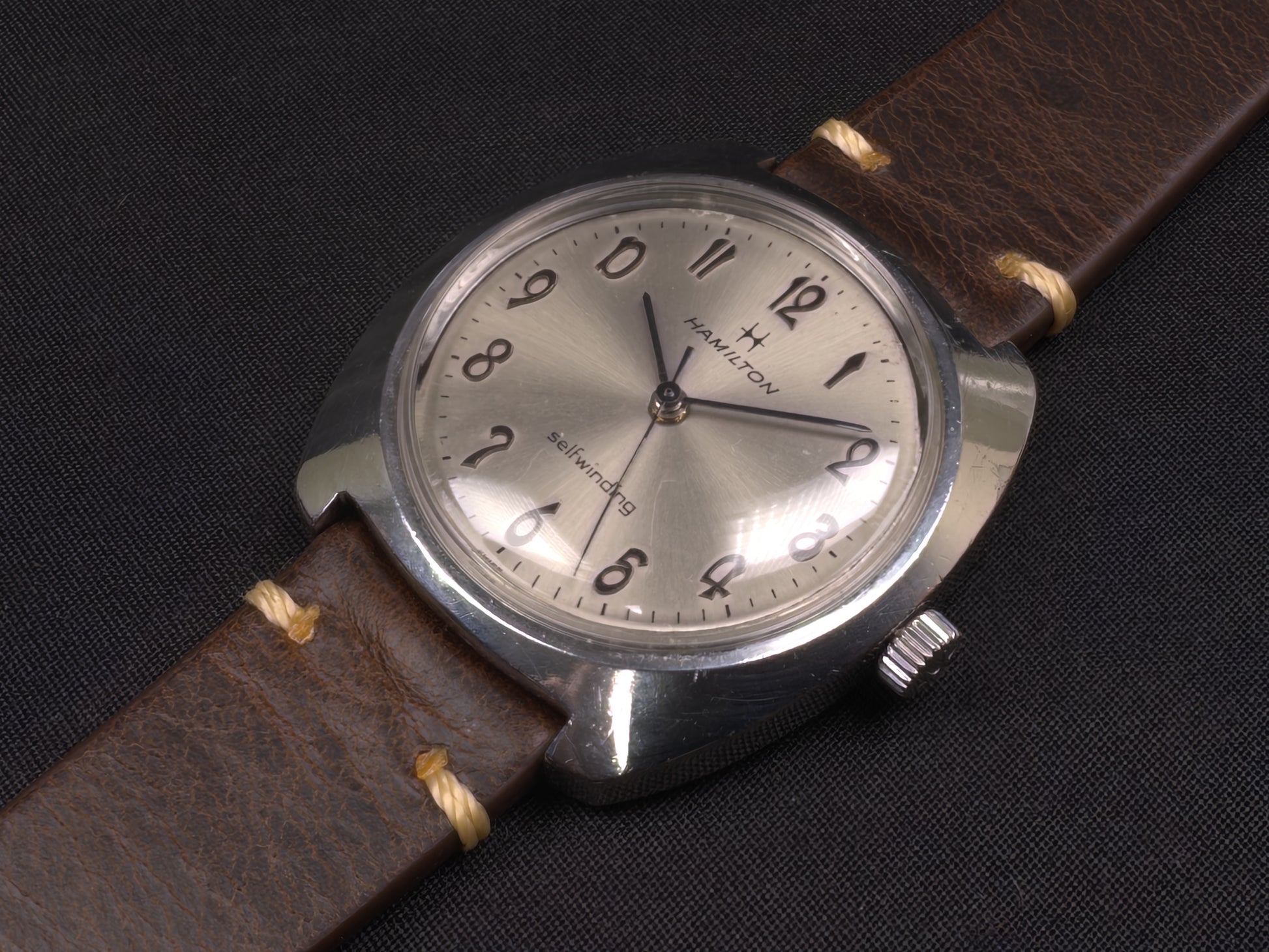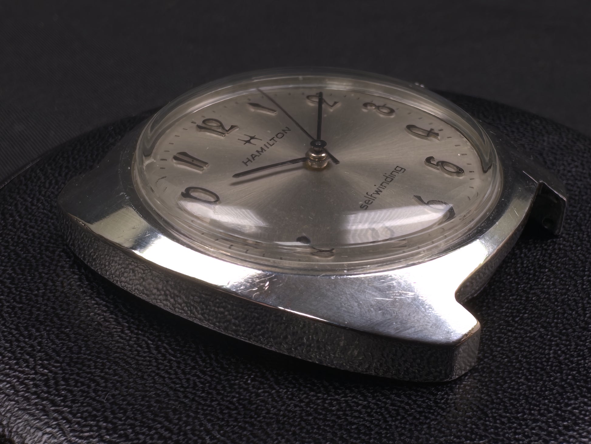 Dial - Original, good condition dial with honest patina. Sunburst silver finish with embossed numerals. Painted Hamilton logo, Hamilton and 'selfwinding' branding, and minute track. Paint on the dial is in very good condition.