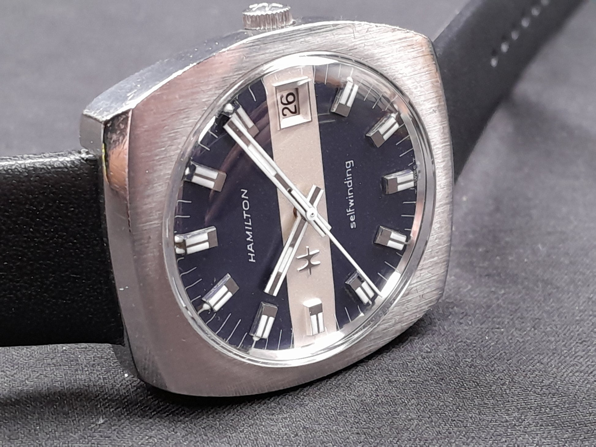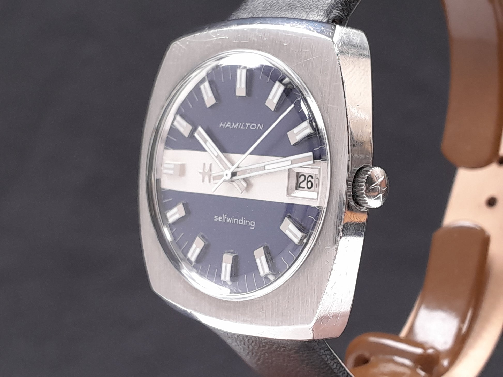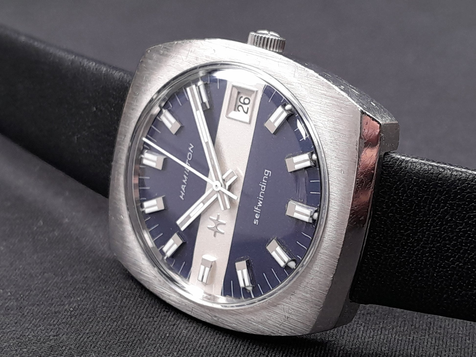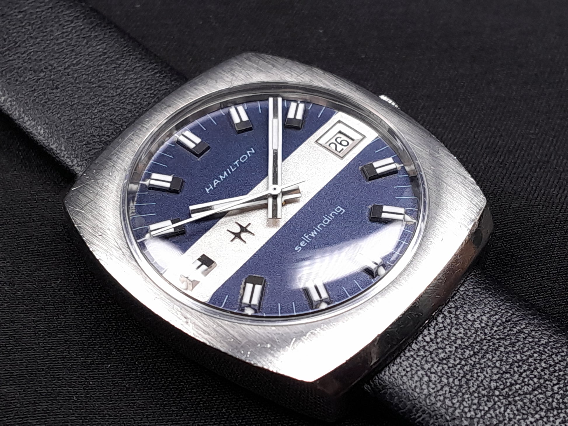 Dial - Blue dial with horizontal silver accent band. Applied silver hour markers with white enamel accents. Applied Hamilton logo. Painted minute track. Paint on the dial is in excellent condition. Hour markers relumed October 2025.
